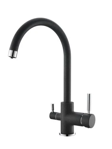 Кухонный смеситель с возможностью подключения фильтра для очистки воды. Фильтрованная вода подается отдельной ручкой через отдельную трубку и не смешивается с водопроводной водой. Однорычажное управление поможет легко регулировать температуру и напор подачи воды. Соответствует стандартам DIN DVGW.