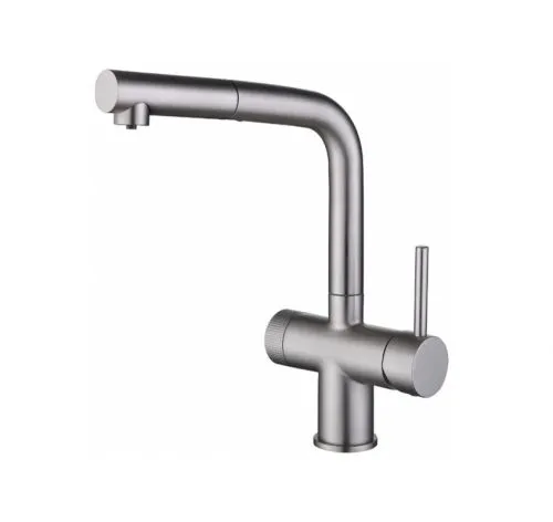 Кухонный смеситель с возможностью подключения фильтра для очистки воды. Фильтрованная вода подается отдельной ручкой через отдельную трубку и не смешивается с водопроводной водой.