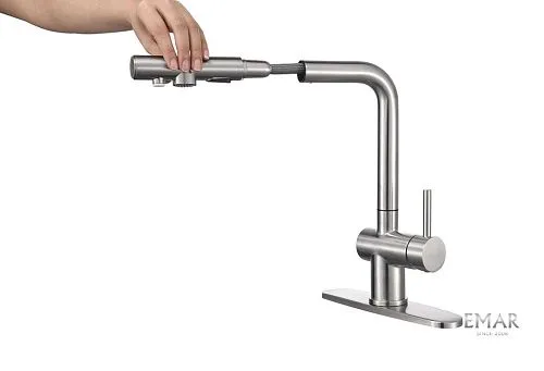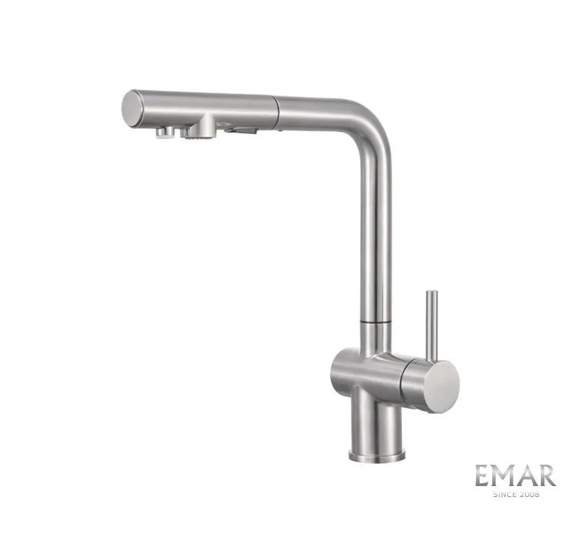 Кухонный смеситель с возможностью подключения фильтра для очистки воды. Фильтрованная вода подается кнопкой расположенной на выдвижном изливе через отдельную трубку и не смешивается с водопроводной водой.