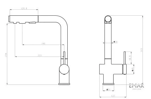 Выдвижной излив увеличивает площадь и эффективность использования смесителя. Дополнительной кнопкой расположенной на выдвижном изливе, возможно переключение режимов подачи воды – струя / душ. Соответствует стандартам DIN DVGW.