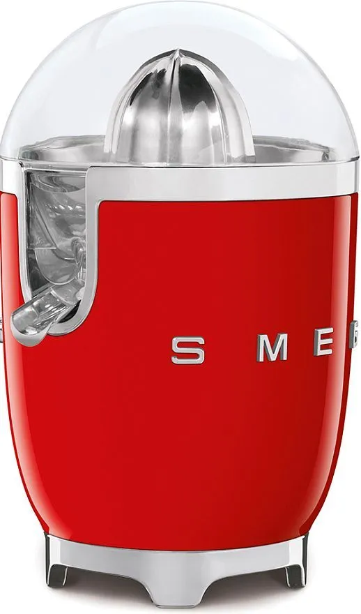 Соковыжималка Smeg CJF11RDEU — стильная модель, выполненная в красном цвете. Устройство оснащено современным двигателем мощностью 70 Вт со встроенным датчиком, благодаря которому отжим начинается после нажатия на прибор. В комплекте поставки: конусная насадка, сетчатый фильтр, хромированное пластиковое кольцо и внутренняя чаша.