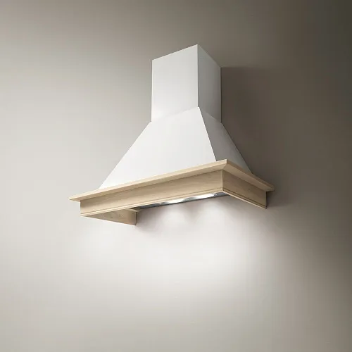Дизайн этой модели продуман до мелочей: светло-бежевый цвет корпуса, багет из натуральной неокрашенной древесины, стилизованные часы – каждая деталь отвечает духу кантри. Даже каминная форма вытяжки подчеркивает «деревенский» стиль оформления. По ширине прибор занимает 60 см – учтите, что у вашей варочной панели должны быть соответствующие размеры. Глубина корпуса составляет 50 см, а высота – 81-92 (в зависимости от наличия воздуховода).