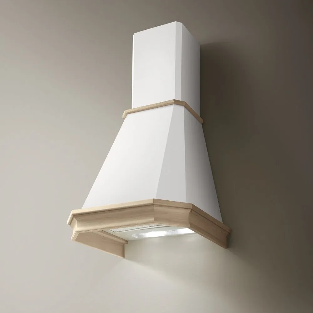 Эта купольная вытяжка, формой напоминающая дымоход старинного камина, идеально подойдет для интерьеров, выполненных в традиционном стиле. Одним из таких направлений является кантри, которому в точности соответствует дизайн вытяжного устройства: массивный корпус белого цвета, деревянная отделка купола, традиционное механическое управление. Но в интерьерах в стиле прованс или рустик эта модель тоже будет хорошо смотреться.