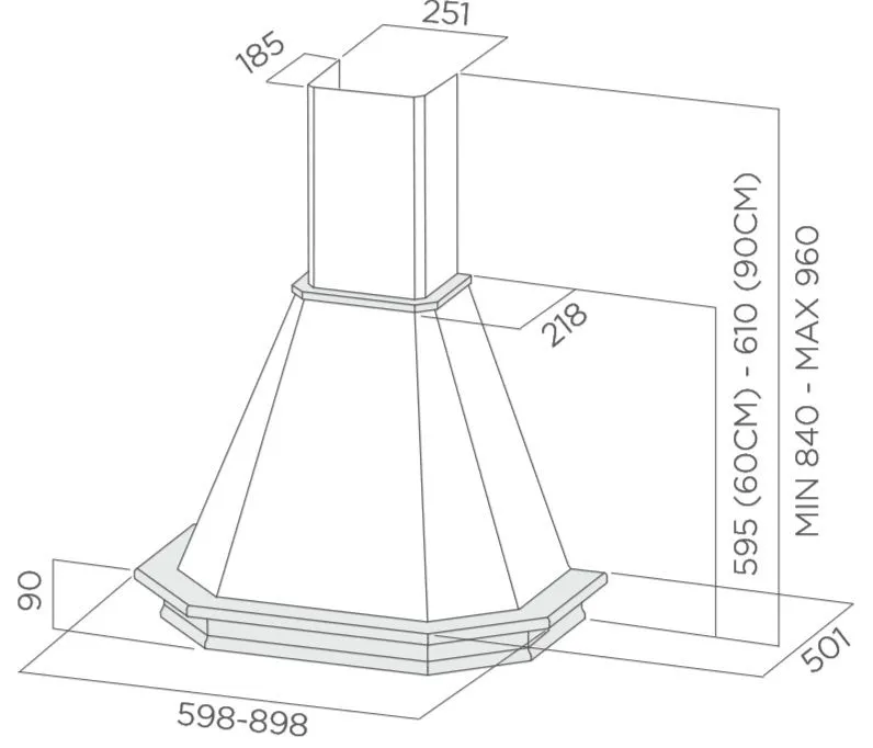 Ширина рабочей панели вытяжного устройства 90 см, что делает его подходящим для установки над варочными поверхностями больших размеров. Мощный мотор обеспечивает производительность 990 м3/час при работе на максимальной скорости. Чтобы обеспечить освещение рабочей поверхности во время готовки, установлены две светодиодные лампы.