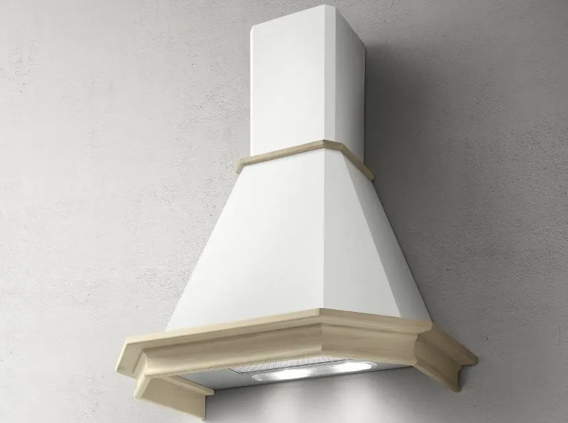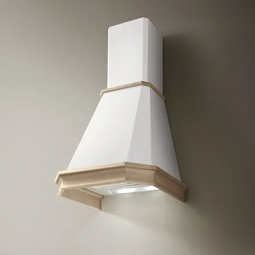 Если вы выбираете классическую купольную вытяжку для большой кухни, оформленной в силе кантри, вам понравится эта модель. Купол пирамидальной формы, окрашенный в белый цвет, дополняется характерными для деревенского стиля декоративными элементами из натурального дерева. Чтобы древесина не пострадала от испарений, на нее наносится специальный защитный состав.
