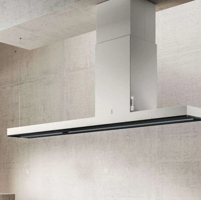 Модификация популярной дизайнерской вытяжки, которая поставляется с широкой передней панелью. У короба с квадратным сечением габариты остались прежними – 32 х 32 см, общая высота конструкции тоже не изменилась – от 84 до 125 см. Модернизация затронула подвесную часть, ее ширина составила 120 см, глубина – 32. Такое конструктивное решение позволило значительно расширить площадь захвата воздуха, увеличив производительность вытяжки, но сохранив прежние показатели энергопотребления и шума. Даже при выборе интенсивного режима вентиляции, устройство продолжает работать в комфортном диапазоне 32-64 дБ. Всего модель поддерживает три стандартных скорости, режим отвода и рециркуляции (опционально).