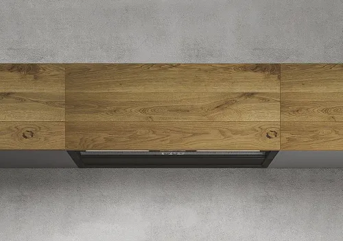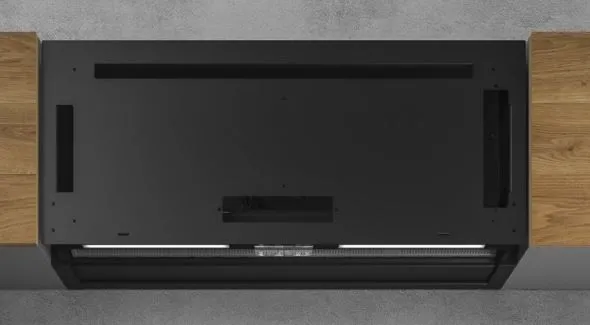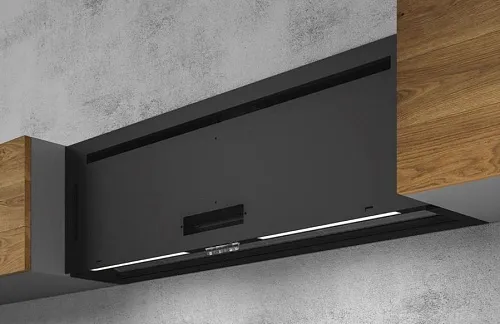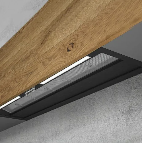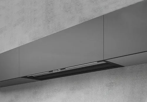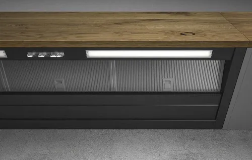 - NAKED, позволяющая отделывать эту модель вытяжки тем же материалом, из которого сделаны дверцы остальных элементов мебели, полностью маскируя вытяжку.