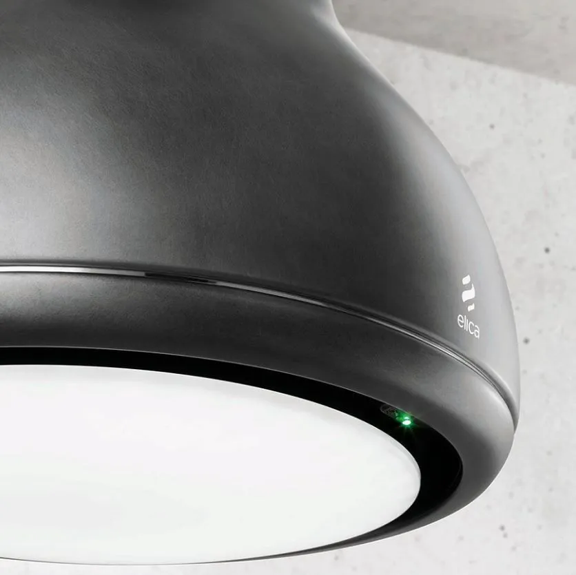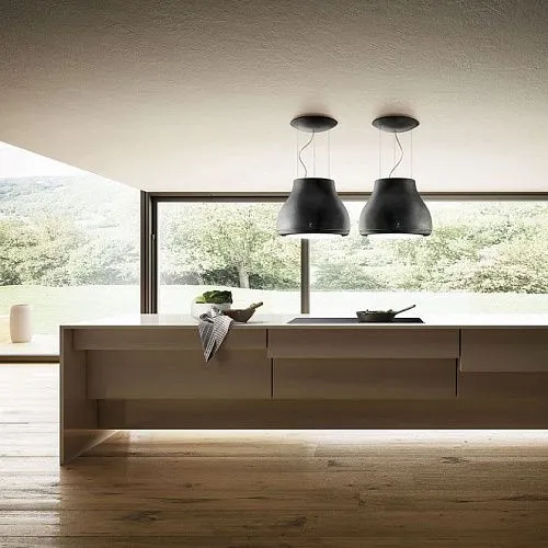 Дизайн можно совместить как с классическим, так и с современным интерьером, особенно в стиле лофт. На нижней кромке расположена панель управления, все функции которой также включаются с пульта ДУ. Потолочный монтаж позволяет установить вытяжку над кухонным островком, однако можно установить модель и на стену.