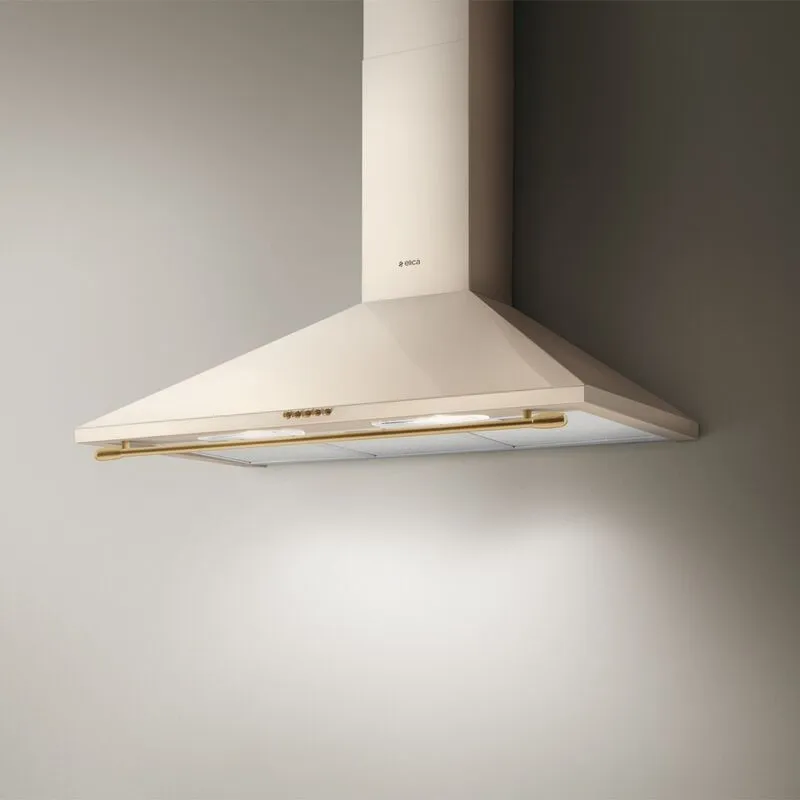 Модель с золотистой фурнитурой станет гармоничным дополнением классического кухонного интерьера. Вытяжка может использоваться как в режиме отвода, так и рециркуляции воздуха. Двигатель мощностью 146 Вт функционирует тихо и экономично расходует электроэнергию. Максимальная производительность воздухоочистителя составляет 750 м3/час. Устройство шириной 90 см устанавливается на стену непосредственно над варочной поверхностью. Цветовая температура светодиодных ламп в 2700 К обеспечивает комфортное и безопасное приготовление еды на плите.