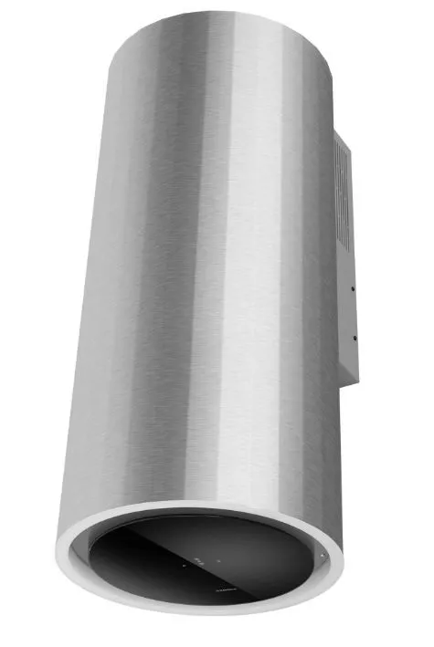 Дизайн вытяжки эффектно выделяется рельефными полосами вдоль цилиндрического корпуса и запоминающейся стеклянной панелью, выполненной в соответствии со всеми тенденциями рынка бытовой техники.