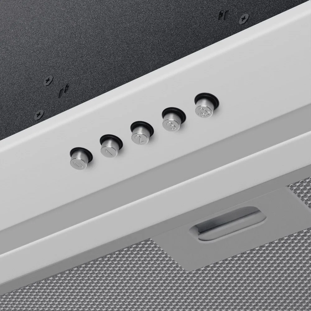 Удобное управление тремя рабочими скоростями и подсветкой вытяжки обеспечивает кнопочная панель. Чтобы прибор смог работать в режиме отвода, потребуется монтаж воздуховода. Для включения режима рециркуляции приобретите отдельно подходящий угольный фильтр.