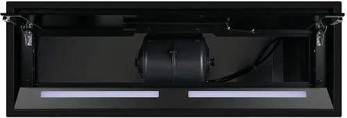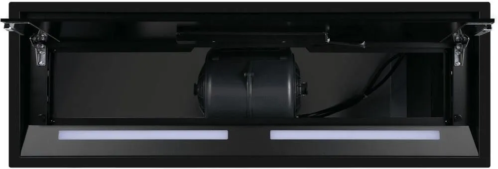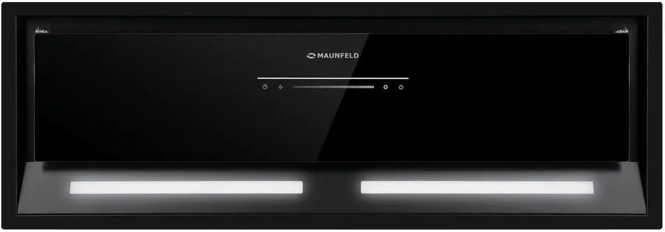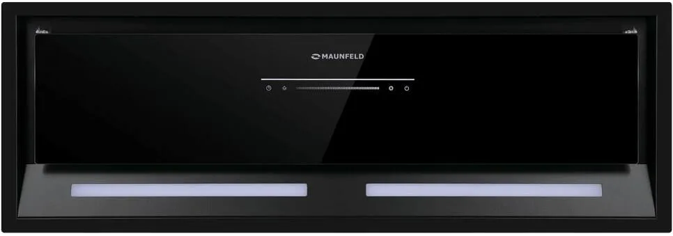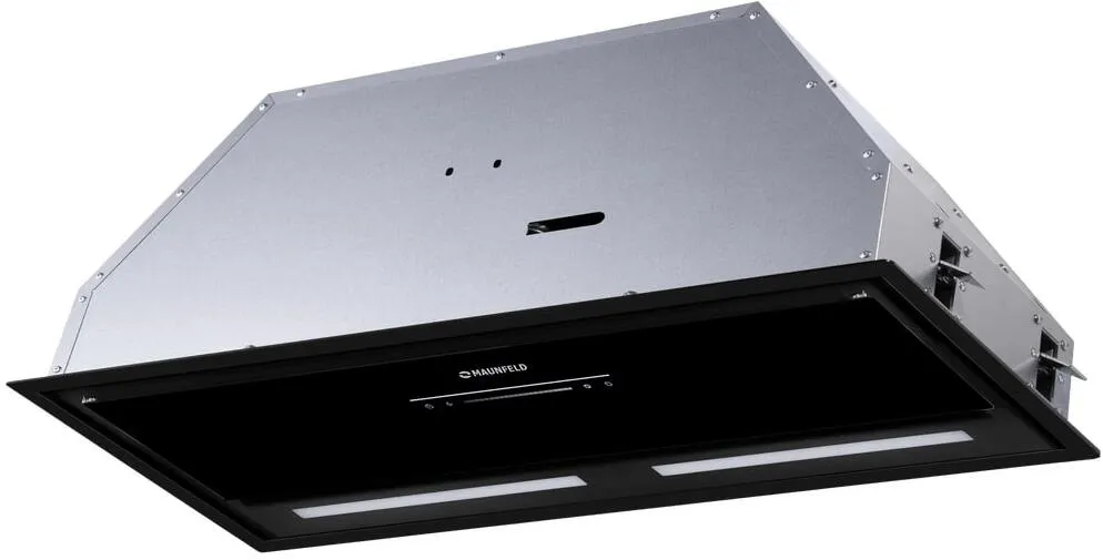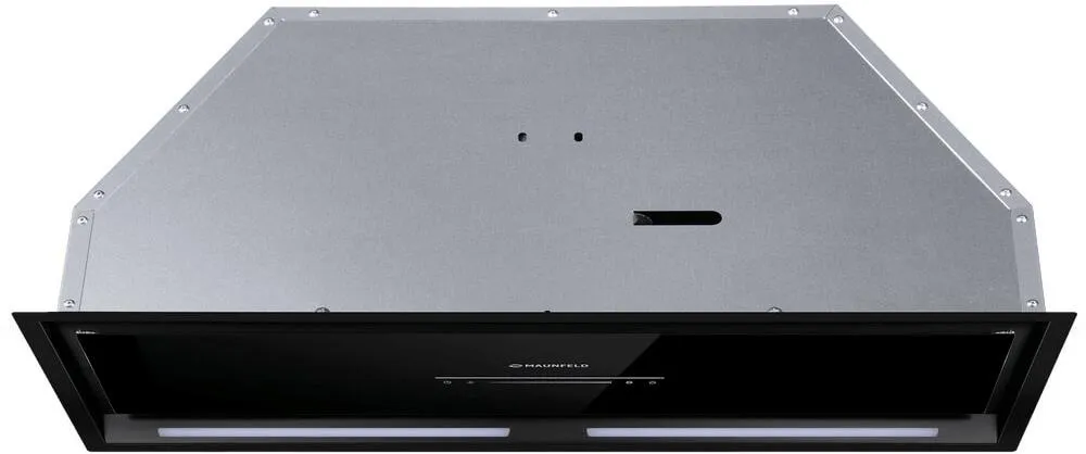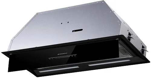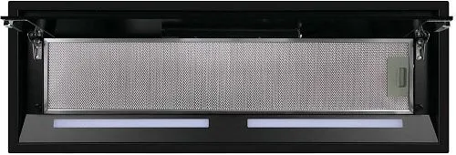 Фронтальная панель выполнена из нержавеющей стали с высококачественным покрытием черного цвета. За откидной панелью из глянцевого закаленного стекла находится многослойный жироулавливающий фильтр, который легко вынимается и полностью разбирается, что сильно упрощает чистку.