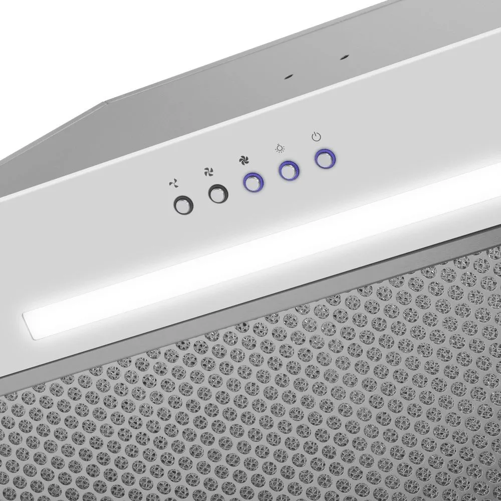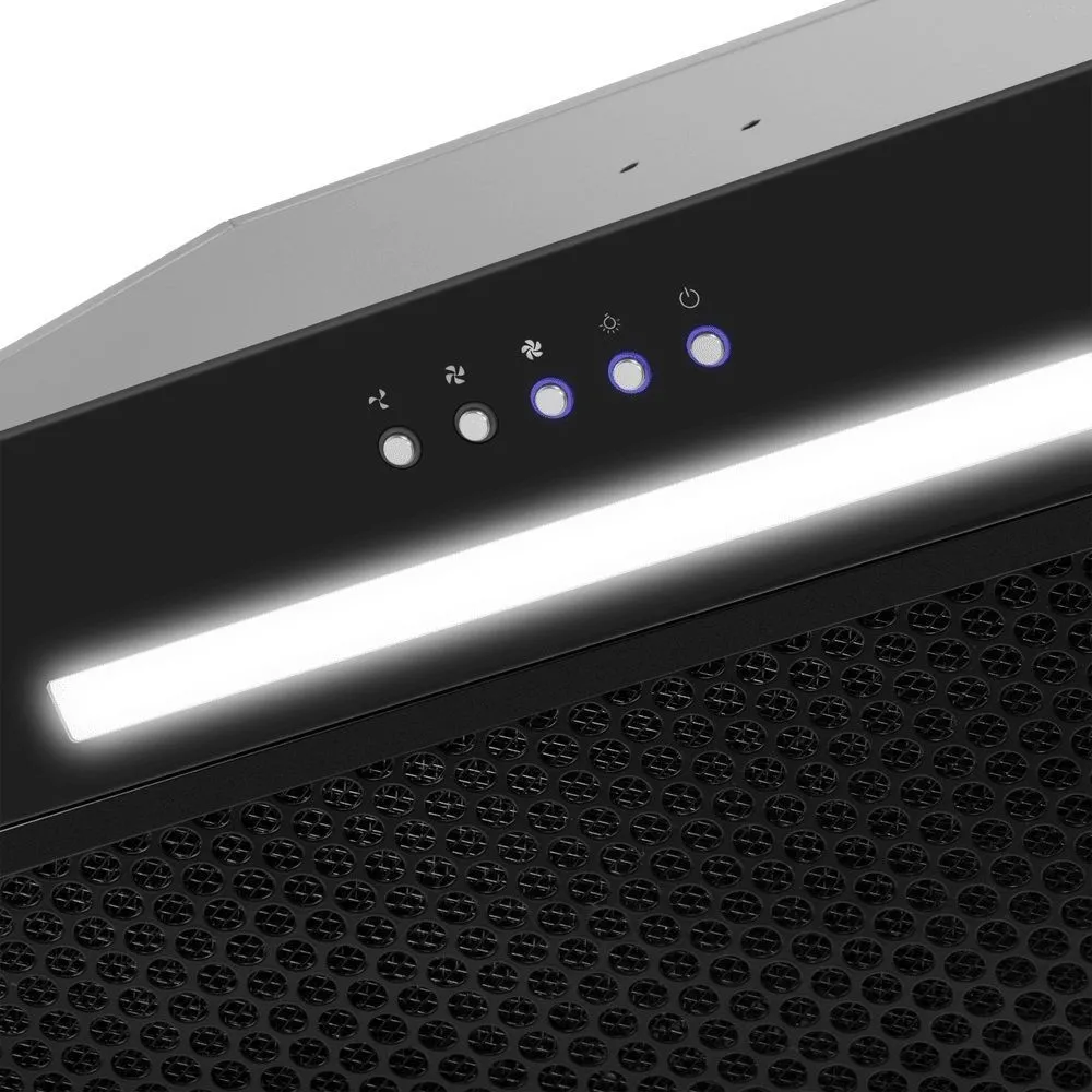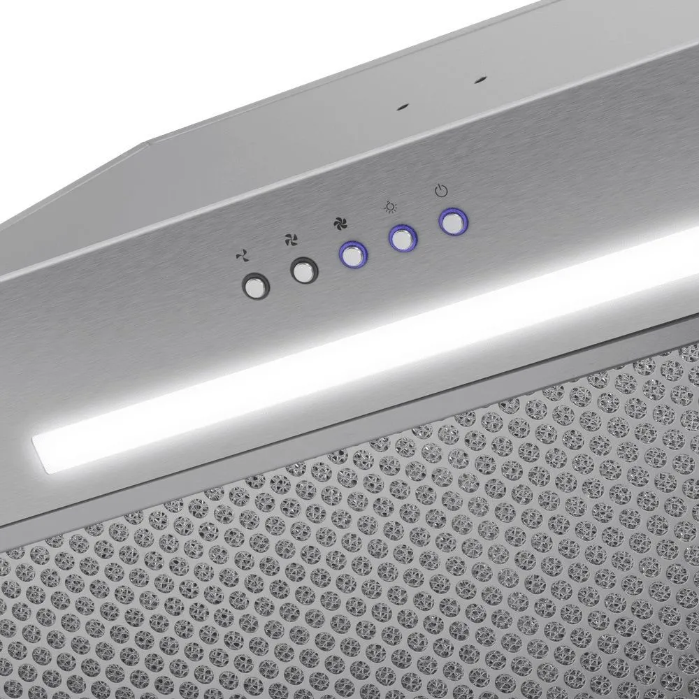 Электронное управление позволяет включить освещение и выбрать одну их 3-х скоростей работы - две стандартные и одна турбо (для быстрой очистки воздуха в экстренных случаях, например, если что-то пригорело). Освещение рабочей поверхности обеспечивается LED-лампой 3,5 Вт .