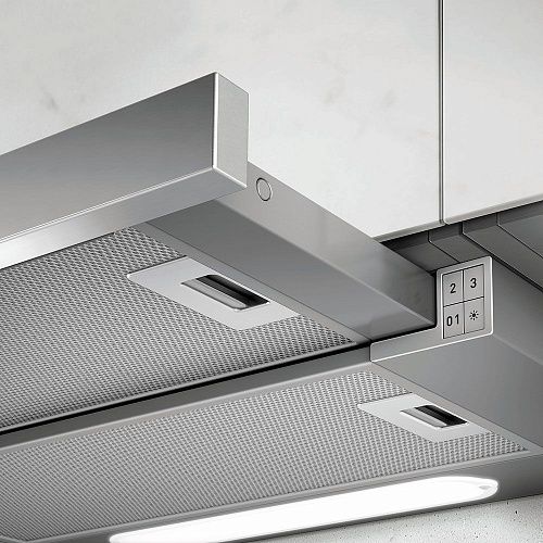 Вытяжка, предназначенная для встраивания в подвесной шкаф, подойдет для установки над варочными панелями шириной до 90 см. Модель идеально подходит для небольшой кухни – производительность прибора до 650 м3/час.