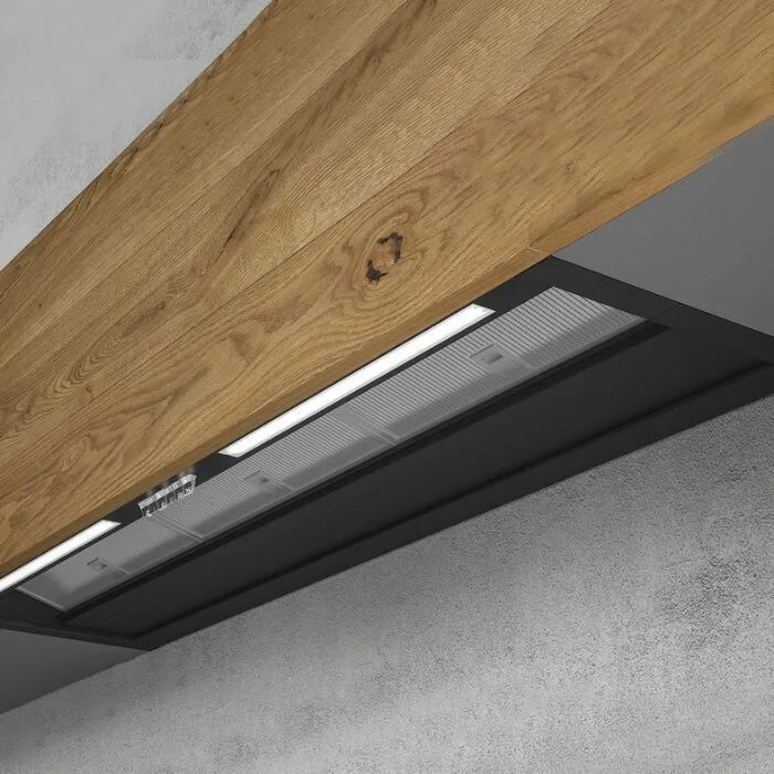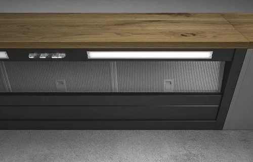 Компактная модель вытяжки имеет ширину всего 60 см, чего достаточно для работы с кухонными плитами и варочными панелями стандартной ширины. Пользователь может разместить на фасаде вытяжку панель из натурального дерева, мебельного щита, МДФ, ЛДСП или полимерных материалов. Устройство легко устанавливается в любой интерьер и подходит к шкафам любой глубины благодаря использованию регулировочного механизма SHIFT 2136.